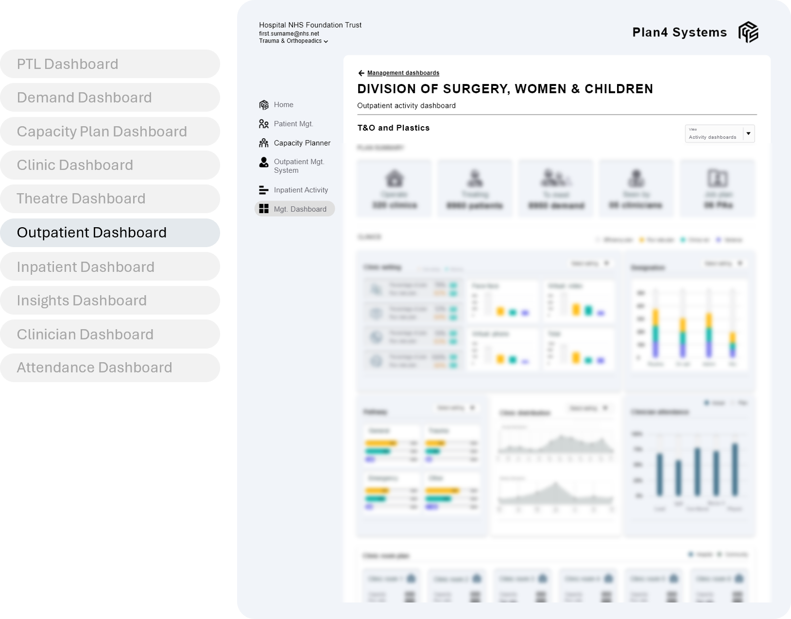 Provides a micro to macro view from an individual clinic or theatre session up to trust or system level reporting requirements. Our dashboards can be filtered across all planning and activity criteria providing a detailed view from all corners of each service.